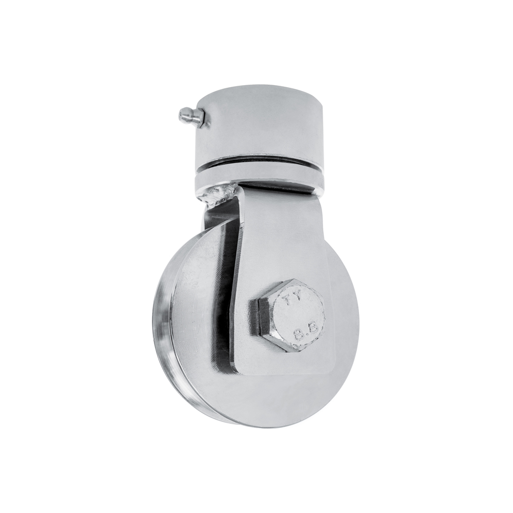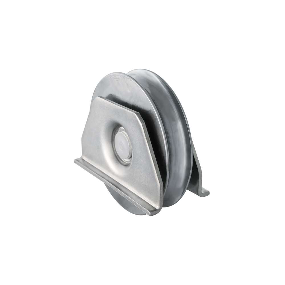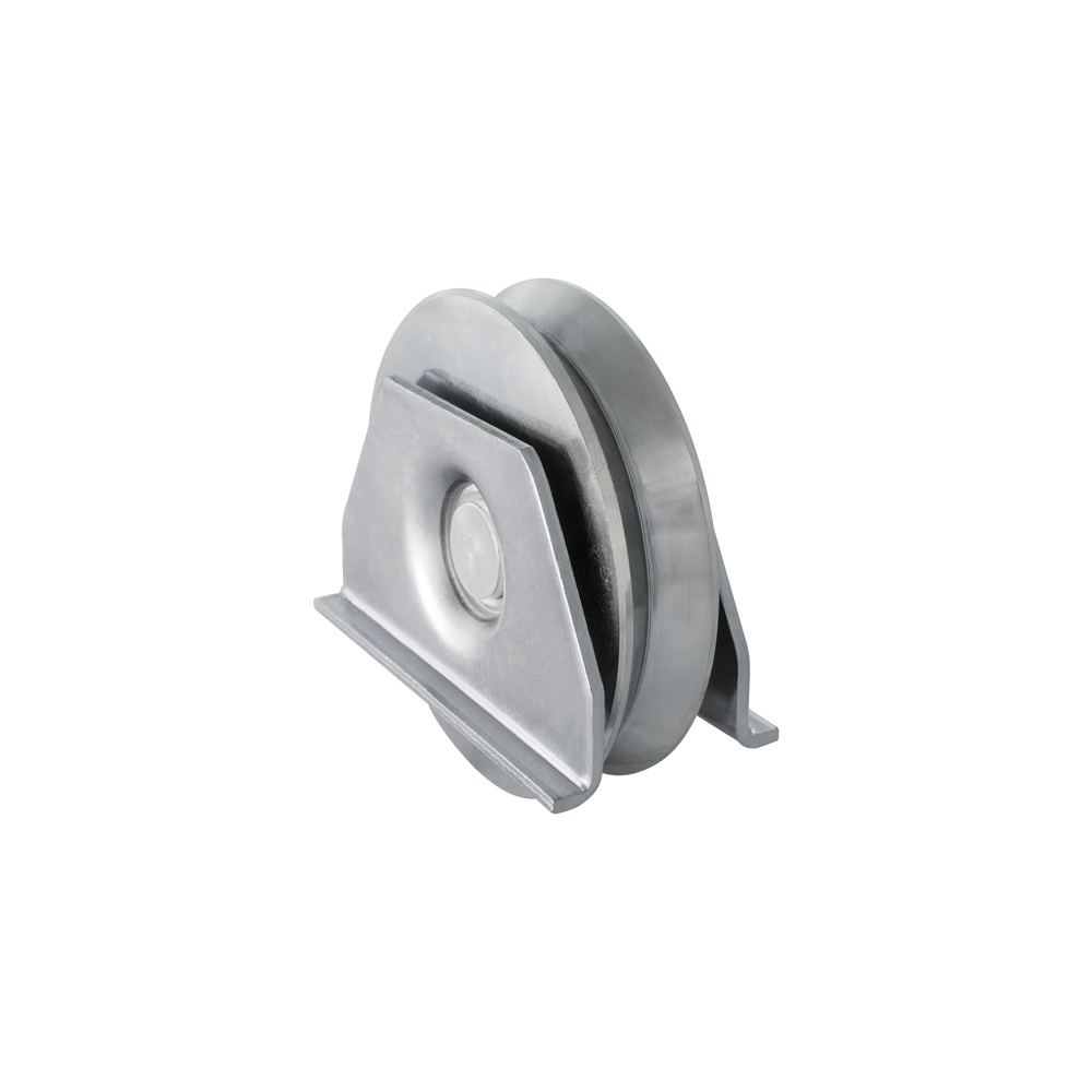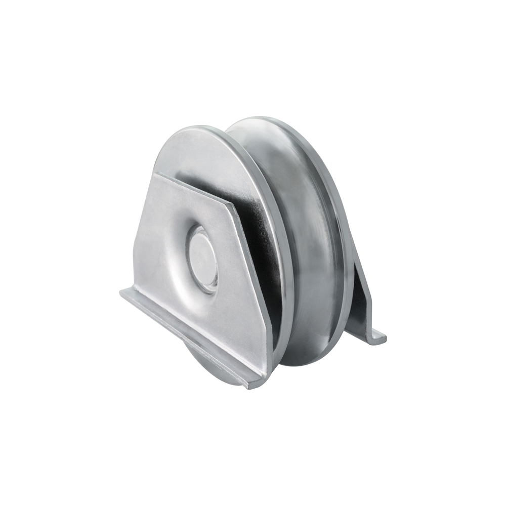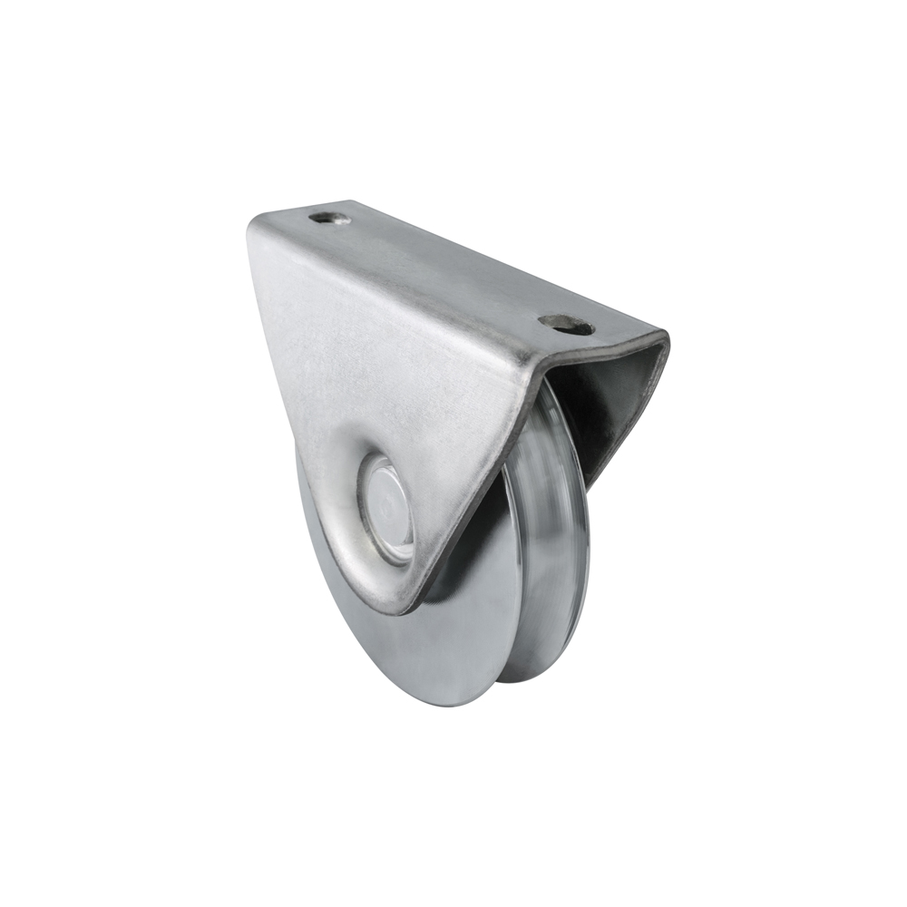 Galvanized wheel with half-round groove and fixing plate with holes.