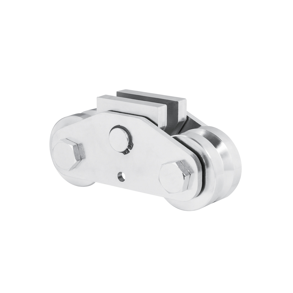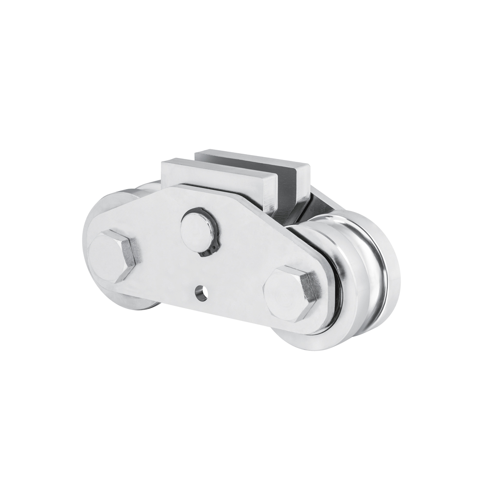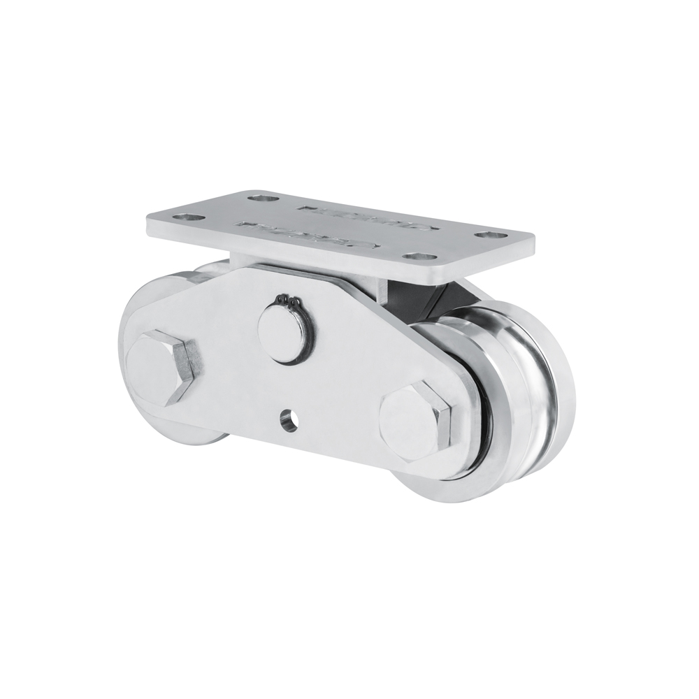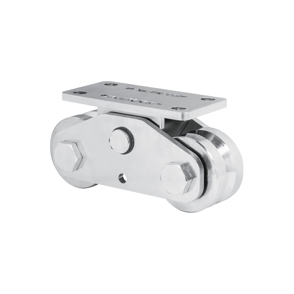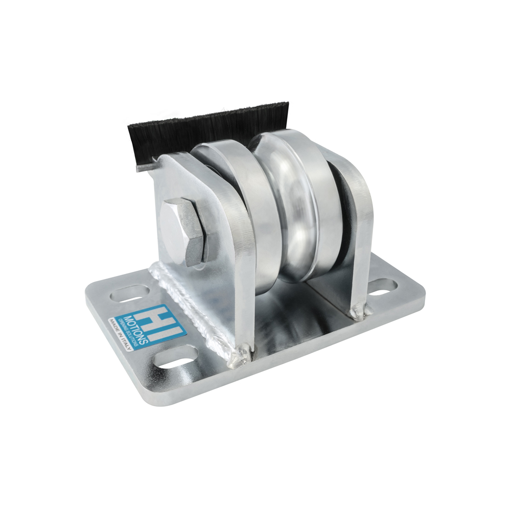 Galvanized wheel with half-round groove and fixing plate with holes.