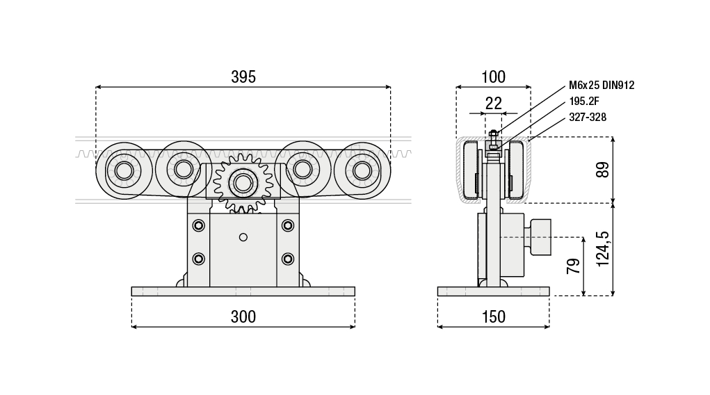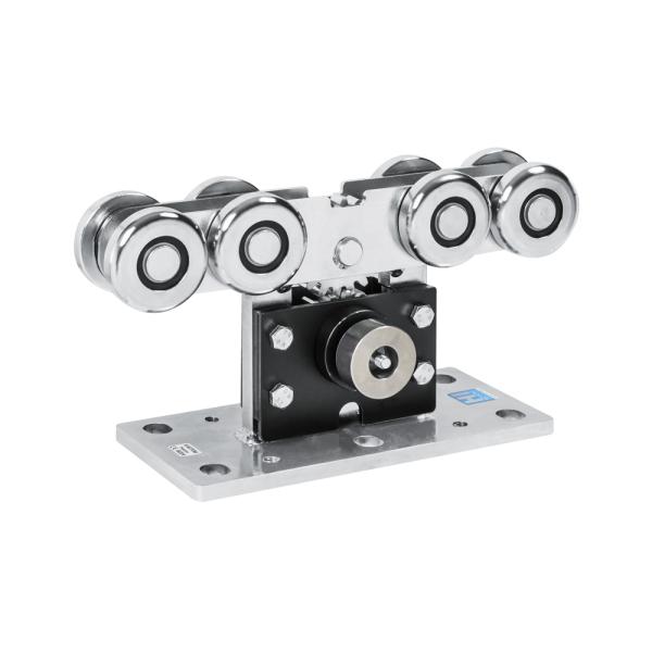 Carriage with 8 wheels, pinion and shaft compatible with Benincà products. Supply of a personalised shaft for the compatibility with varied automations.