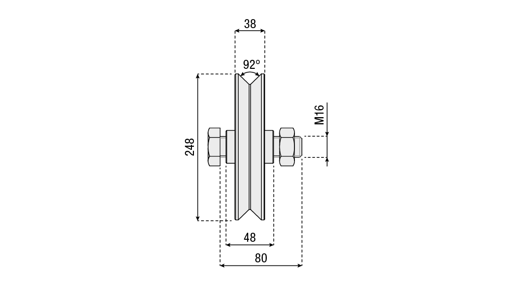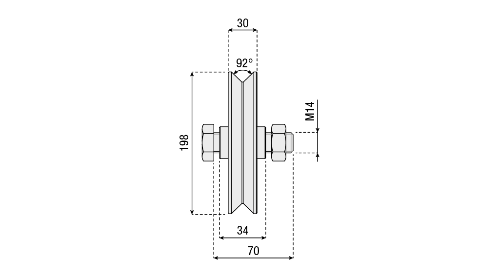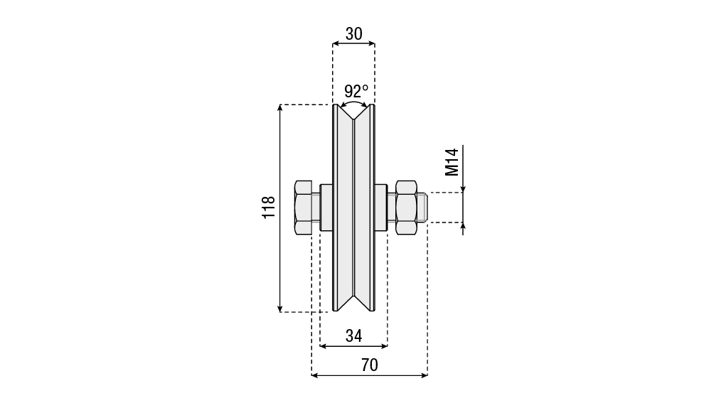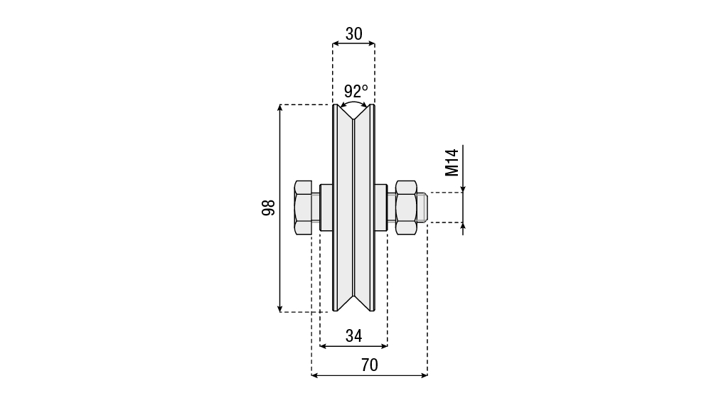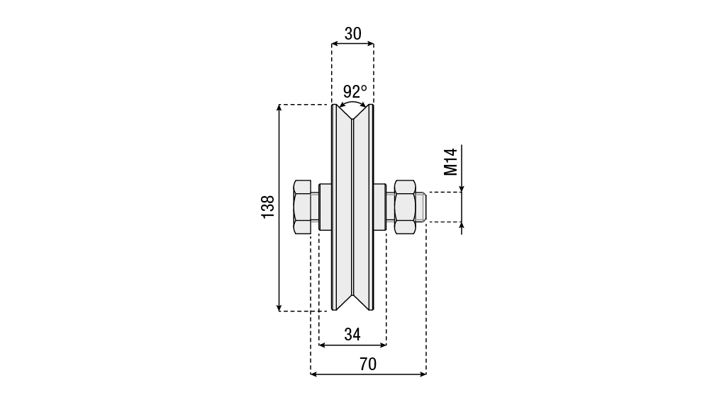 Galvanized wheel with bolt, with V groove, 2 bearings.