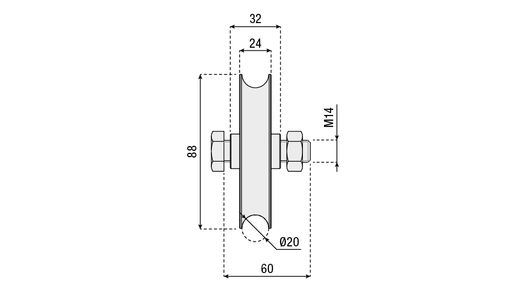 Galvanized wheel with bolt, with half-round groove, 1 bearing.